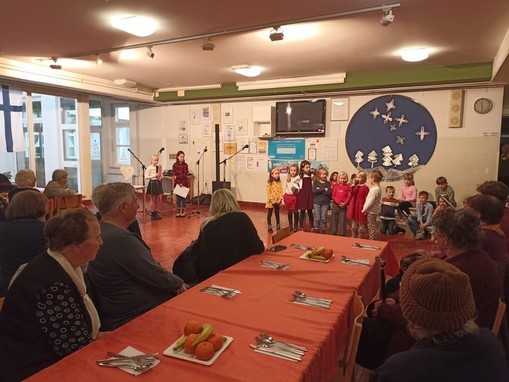 Veseli smo bili vseh udeležencev našega srečanja občanov občine Vipava, starih 80 in več let, ki je potekalo 10. 12. na OŠ Draga Bajca Vipava. Kar 59 obiskovalcev so uvodoma pozdravili župan Anton Lavrenčič, ravnateljica Mojca Pev in podpredsednik RK Alfonz Krapež, ki je tudi izročil nageljček najstarejšima udeležencema Jožetu Strnadu, 93, in Ivani Lavrenčič, 92. Presenetil nas je udeleženec Danilo Rovan, ki je za oba in tudi za nas izdelal čudovit kamnit srček. Učenke in učenci 1. razreda so zapeli v zborčku ob spremljavi kitare in pripravili recitacije, vse simpatične nastope pa sta povezovali učenki Pavla Lazić in Lara Rondič. Srečanje so popestrili tudi solopevka Veronika Knafelc, harmonikaš Gašper Semenič, Kvartet Bršljan in Plesni Klub Adc z nastopom skupine Ajda, plesnega dua in združenega božičnega nastopa vseh. Vsem se iz srca zahvaljujemo, da so z nami delili njihove talente. Najlepša hvala tudi kuharicam v šoski menzi, ki so nam pripravile odlično kosilo.